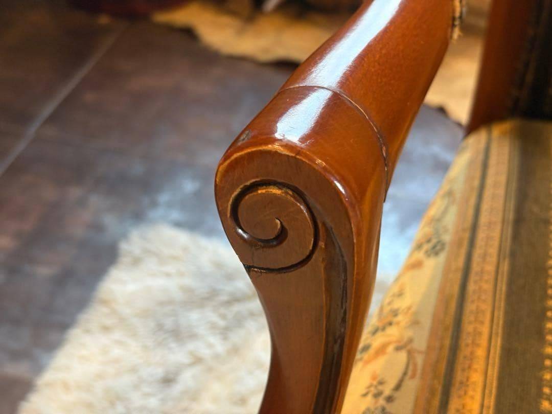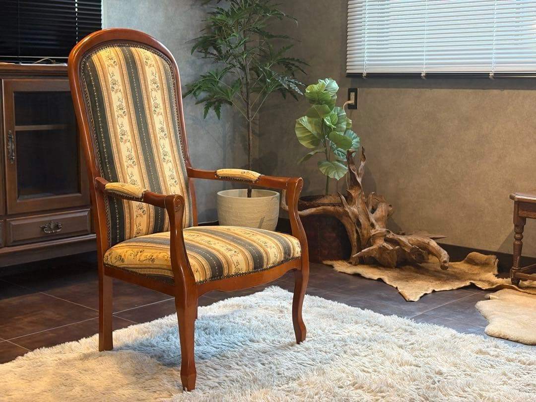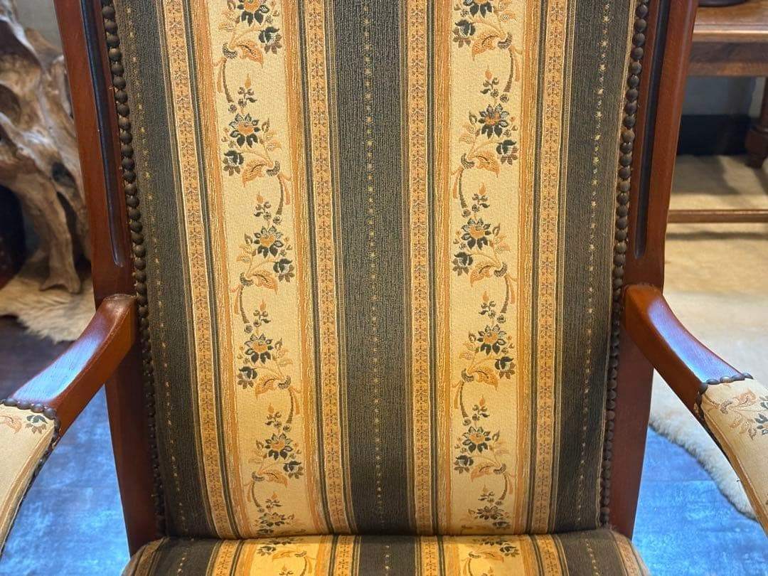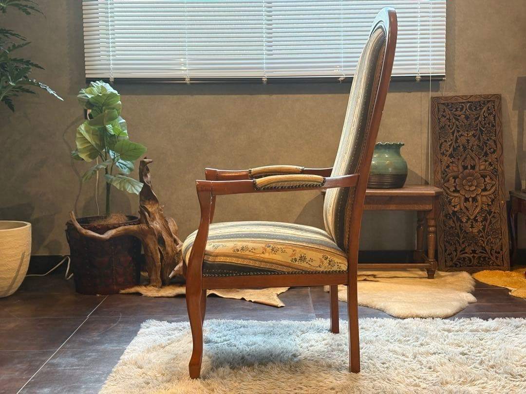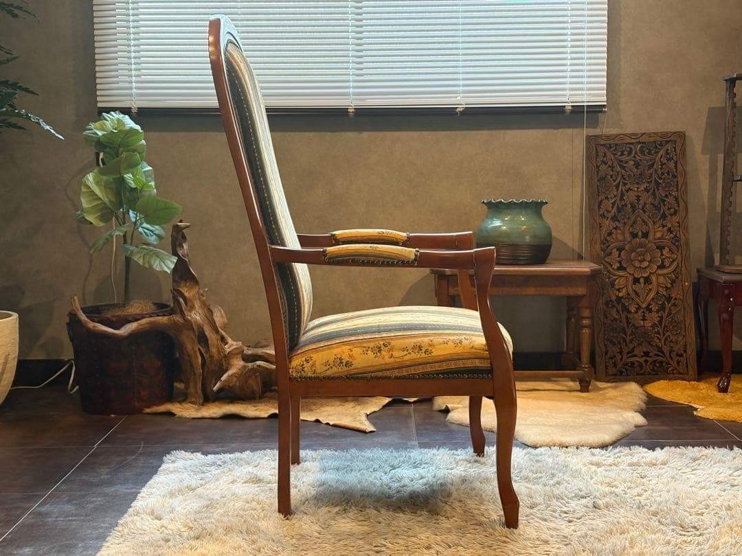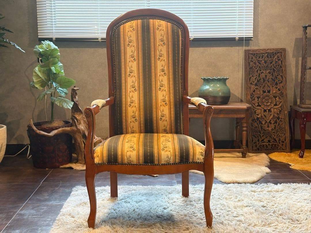 こちらは、ヨーロッパのエレガントなアームチェアで、ハイバックデザインが特徴的な一品です。