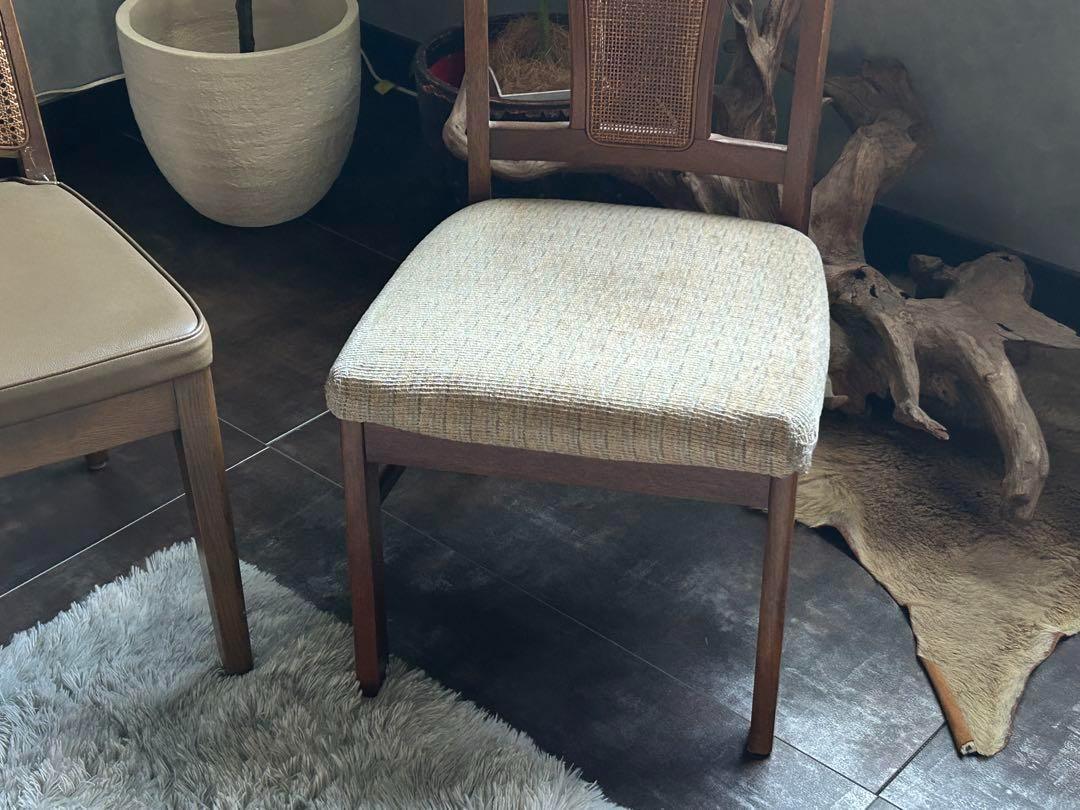 背もたれ部分のラタンが程よく抜け感を演出し、通気性も確保。座面はファブリック仕様でやわらかな掛け心地です。