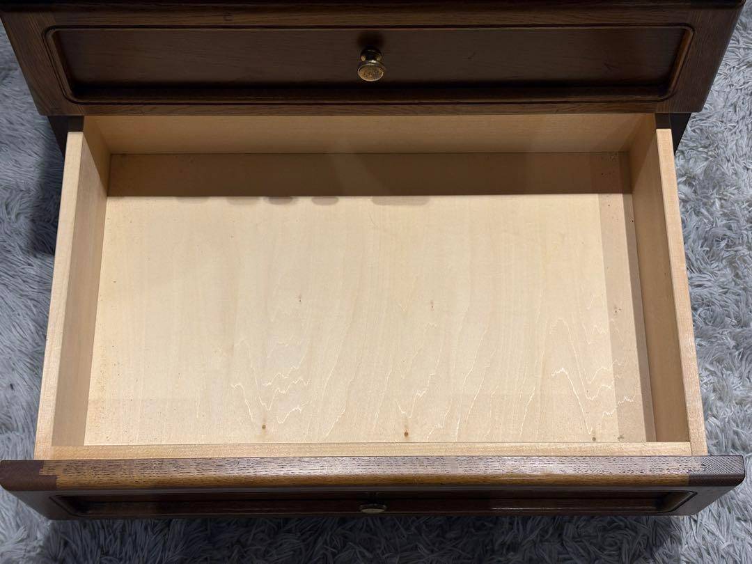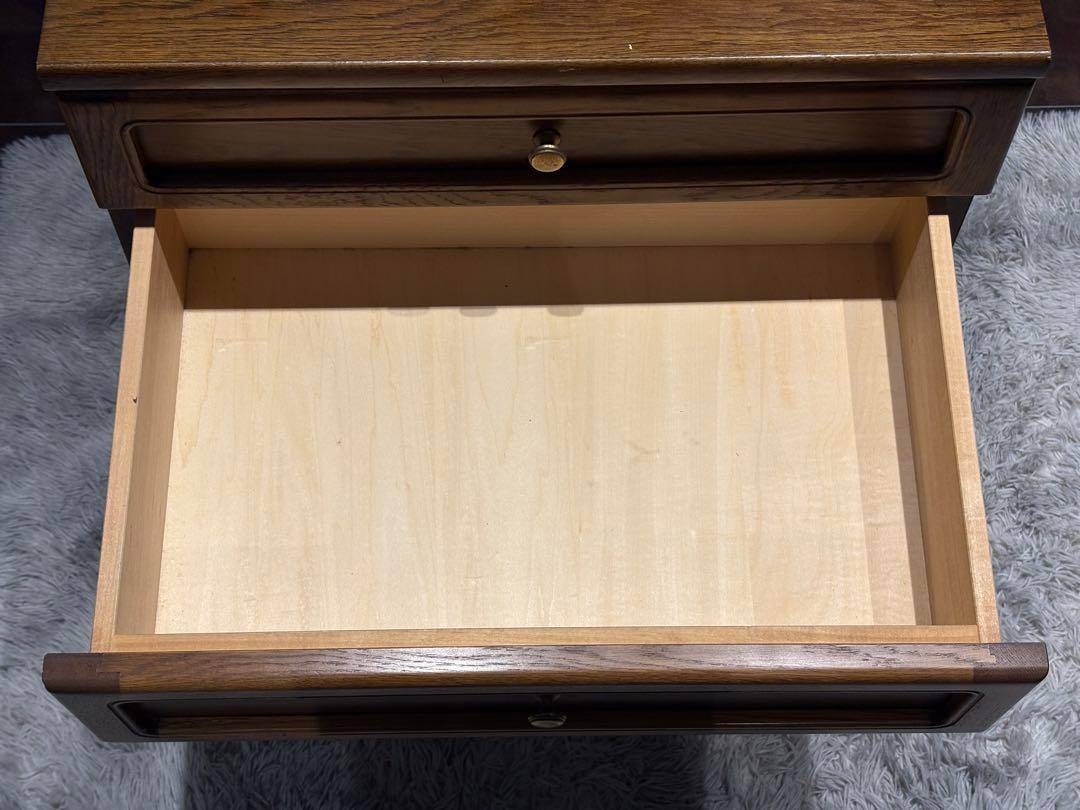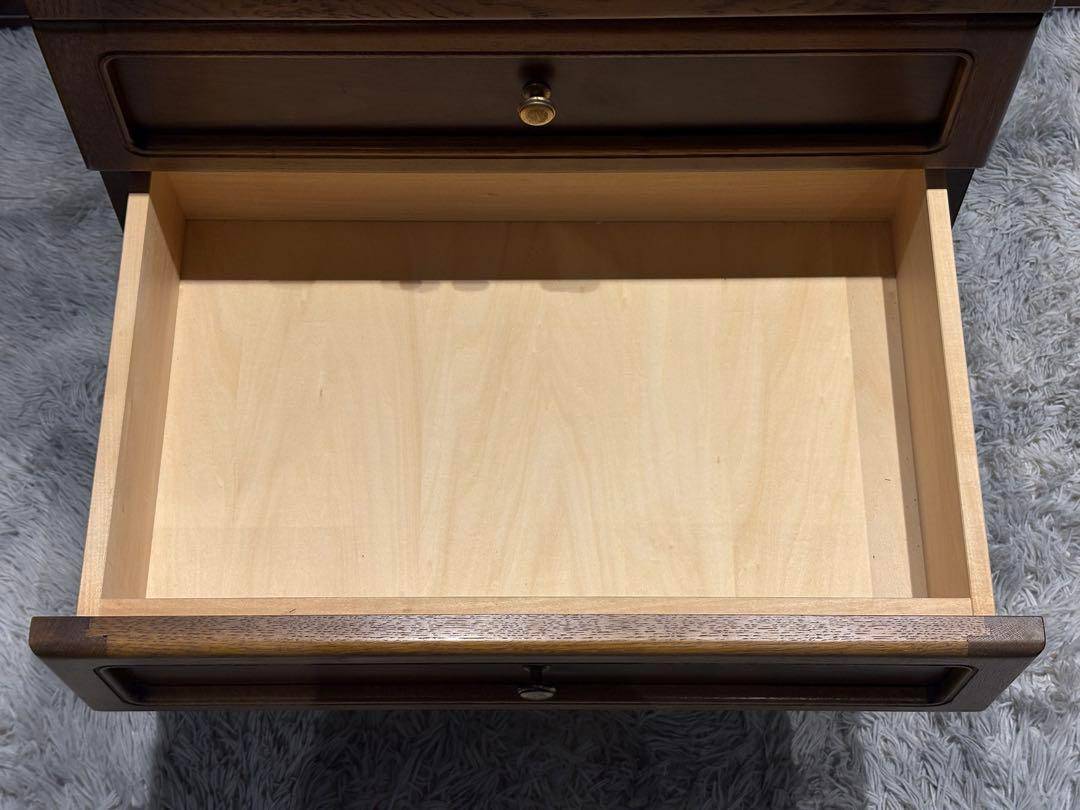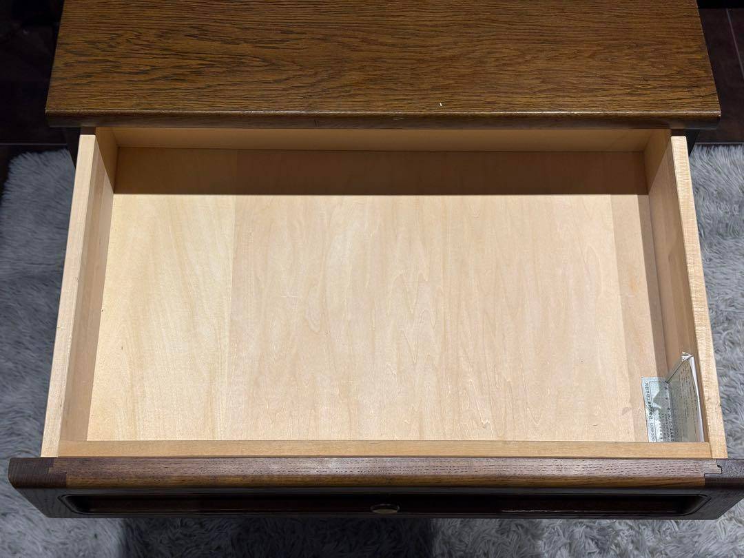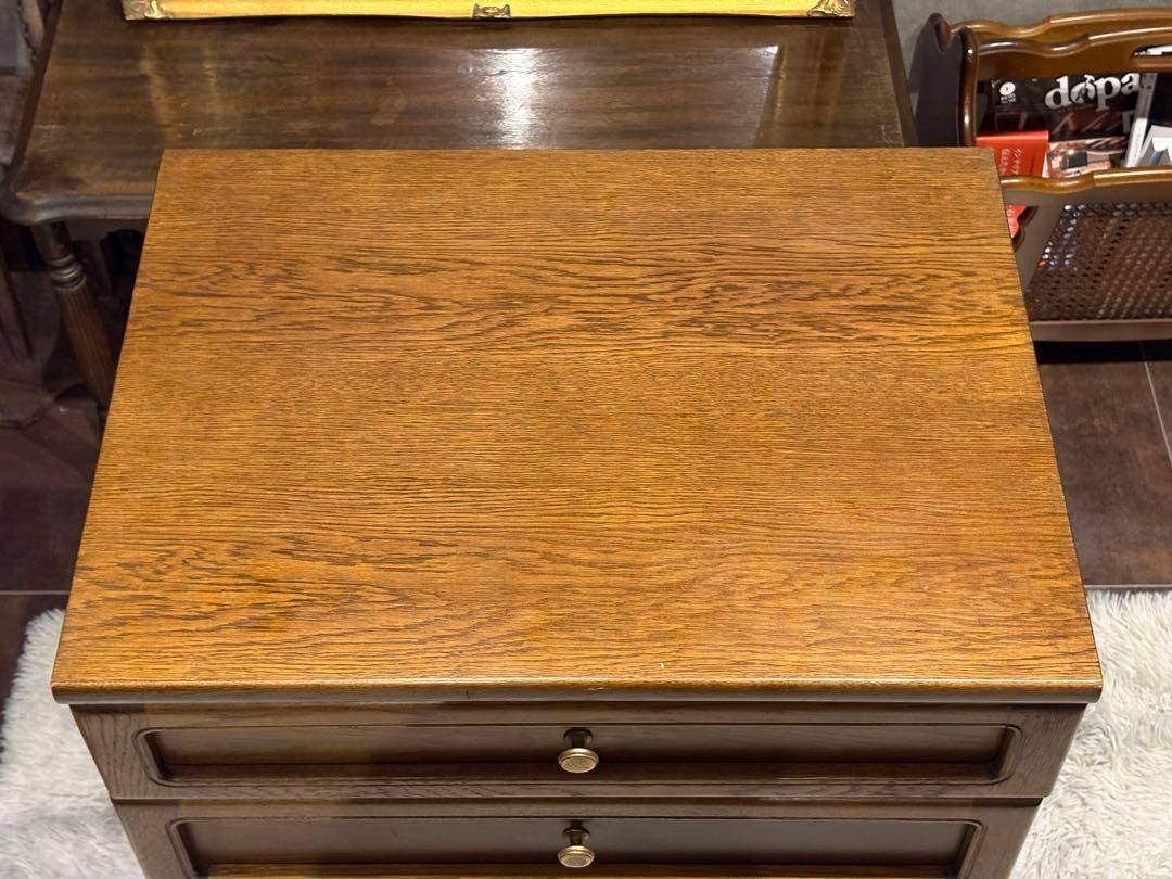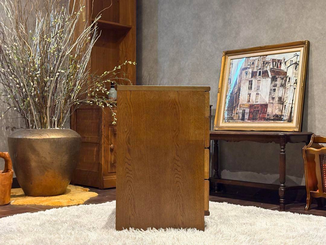 こちらはカリモク製の4段チェストで、長年にわたって愛されてきたヴィンテージアイテムです。 カリモクらしい堅牢な木製構造と美しいオーク材の質感が特徴で、シンプルながらも上品なデザインが魅力的です。 引き出しの取っ手には細やかな装飾が施され、使い勝手と見た目を両立しています。 オールドカリモクの代表的なスタイルを感じさせるこのチェストは、ベッドサイドテーブルや収納家具として幅広く活用できます。 時代を経ても色褪せないデザインと高い実用性が特長で、ヴィンテージ家具好きな方にぴったりです。